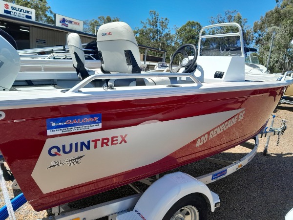 🛥️ FOR SALE: Quintrex 420 Renegade Side Console – Crimson Sea / White - 80th Anniversary Silver Pack Price: $32,900 ________________________________________ 🚤 Boat Details: Model: Quintrex 420 Renegade Side Console – Crimson Sea / White - 80th Anniversary Silver Pack • Engine: Suzuki Lean Burn DF50ATHL-White o 50HP, 3-cylinder, 941cc, 4-stroke o Electric start, Power trim, Lean Burn Technology o White PERMATRIM o 3+3 Year Warranty ________________________________________ 📡 Electronics & Controls: o Suzuki SMG4 Digital Multi-Function Display o Suzuki Side Mount Controls o GT54UHD Transom Mount Transducer ________________________________________ 🚚 Trailer: • Quintrex 749kg ATM Alloy Trailer o Includes 12 months QLD trailer rego ________________________________________ 🧰 Features & Inclusions: • Quintrex Blade Hull, Cuts through rough water like a knife • Casting Platform with Sea Spiggot • Rear Casting Platform with Live Bait Tank • Angler Sport Seats • Transducer Brackets • Live Bait Tank • Side Pockets • Electric Trolling Motor Bracket • Large Accessory Kit (Nav Lights, Anchor Light, Auto-Bilge, Isolator Switch, Switch Panel) • Transom Step and Rail • Century Marine MP680 Maintenance-Free Battery • Suzuki 25L Fuel Tank with Gauge • Water Trap Fuel Filter ________________________________________ 🛟 Safety & Compliance: • Smooth Water Safety & BMT Kit (up to 4.4m) includes: o Anchor kit o Paddles o Mirror o Vee sheet o PFDs for max rating o Motor support bracket o Tie-down strap • 12 months QLD boat registration ________________________________________ Available now at Boats Galore Bundaberg Don't miss this great package – $32,900 Available Now – Get on the Water!